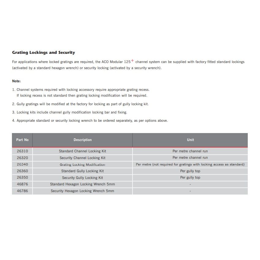 ACO Modular 125 Security Hexagon Locking Wrench 5mm. For applications where locked gratings are required, the ACO Modular 125+ channel system can be supplied with factory fitted standard lockings