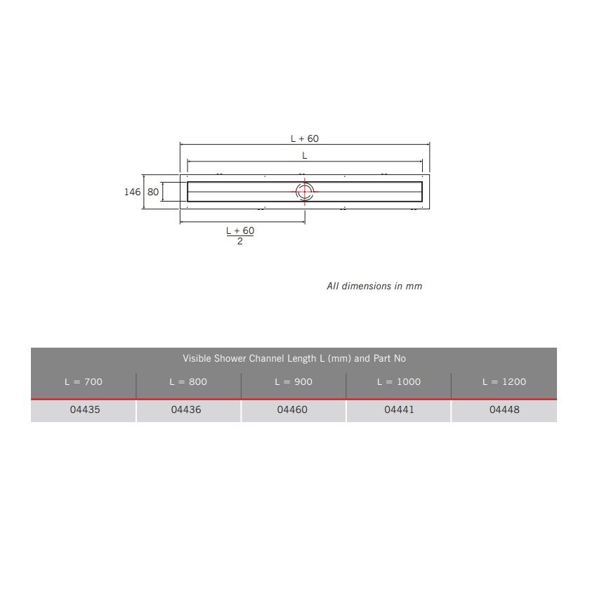 ACO Stainless Steel Shower Channel System for tiled flooring - available in five lengths, 700-1200mm gratings designed to fit most applications (Grating not included).