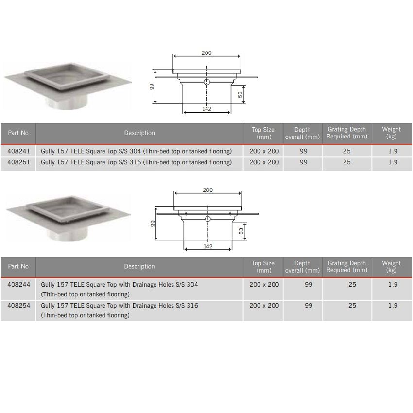 Hygienic Stainless Steel Gully 157 - Telescopic Square Gully Top, Top Size 200 x 200mm, Suitable For Thin-bed Top Or Tanked Flooring. 99mm Depth