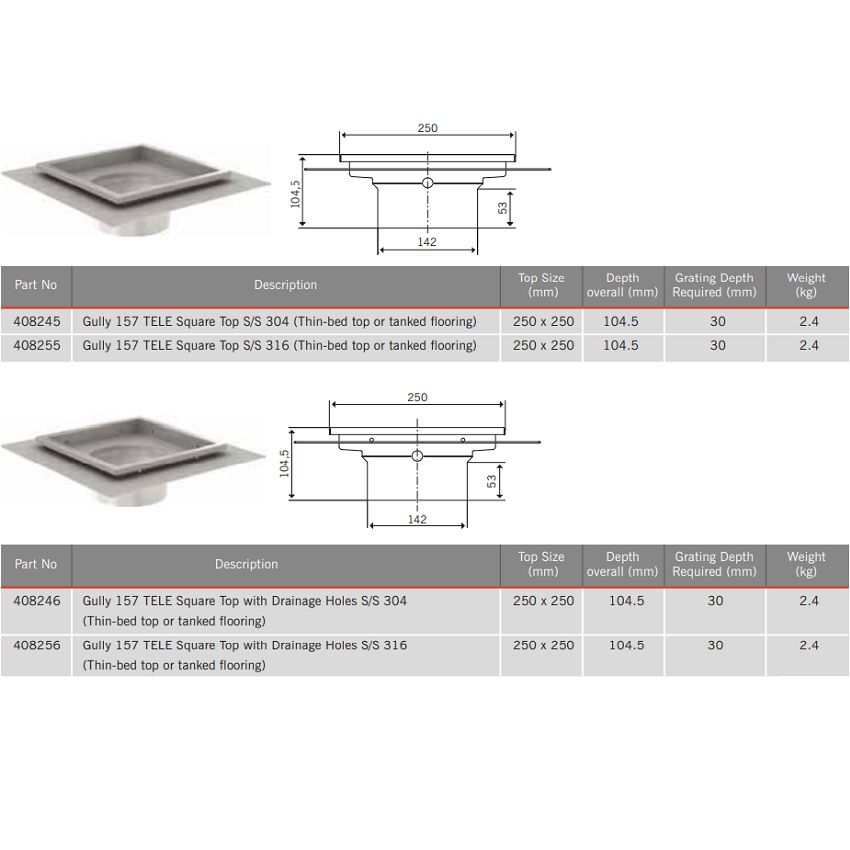 Hygienic Stainless Steel Gully 157 - Telescopic Square Gully Top With Drainage Holes, Top Size 250 x 250mm, Suitable For Thin-bed Top Or Tanked Flooring. 104.5mm Depth