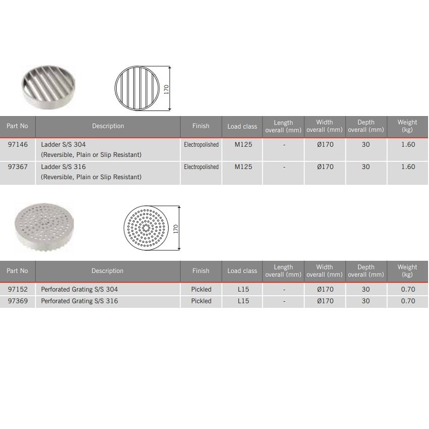 Hygienic Stainless Steel Gully 157 - Plain Ladder Grating For Vinyl Top, 30mm Deep