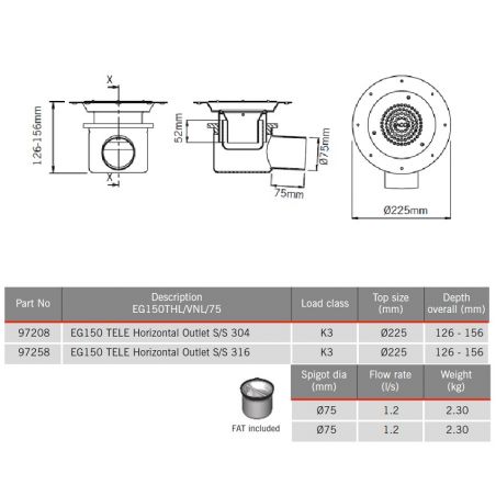 ACO Hygienic Stainless Steel EG150 Gully - Telescopic Vertical 110mm Outlet With 3 Inlets