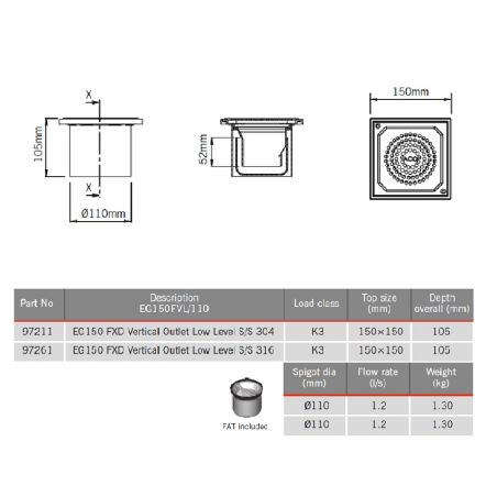 ACO Hygienic Stainless Steel EG150 Gully - Fixed Height Vertical Spigot 110mm Outlet Body, Top size 150x150mm, suitable for Cementitious/Resin Screed and Tiled Floora