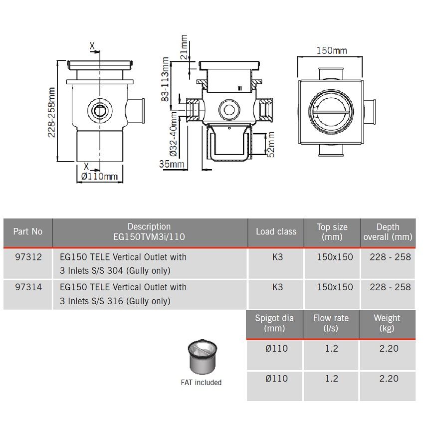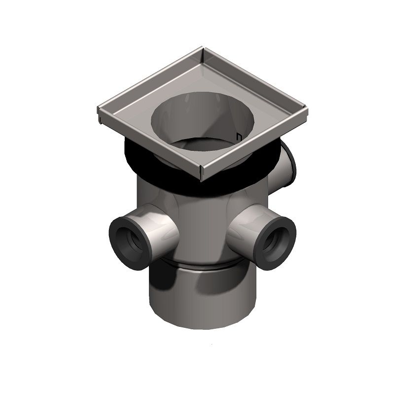 ACO Hygienic Stainless Steel EG150 2 Part Gully System - Telescopic Vertical Outlet With 3 Inlets (Gully Only) 110mm Outlet Body, Top size 150x150mm, suitable for Cementitious/Resin Screed and Tiled Floors