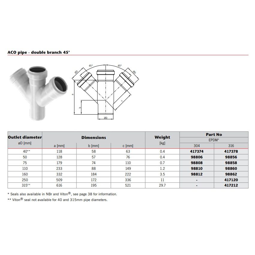 ACO Stainless Steel Socketed 45 Degree Double Pipe Branch, available in 7 diameters 40mm, 50mm, 75mm, 110mm, 160mm, 250mm & 315mm, with a complete range of fittings.