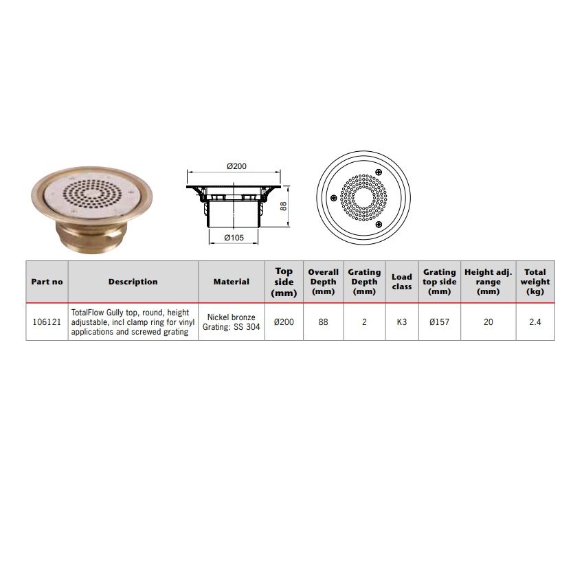ACO TotalFlow Gully Top Nickel Bronze with Stainless Steel Grate, Adjustable Height, Screwed Grating, with clamp ring for Vinyl applications.