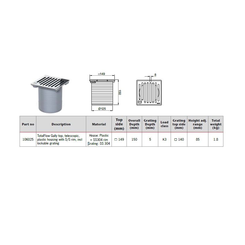 ACO TotalFlow Gully Top Plastic Telescopic with Lockable Slot Stainless Steel Grate.