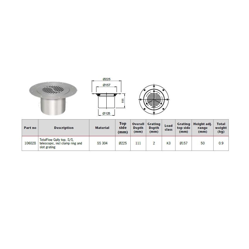 ACO TotalFlow Gully Top Stainless Steel Telescopic with Clamp Ring & Slot Slot Grate.