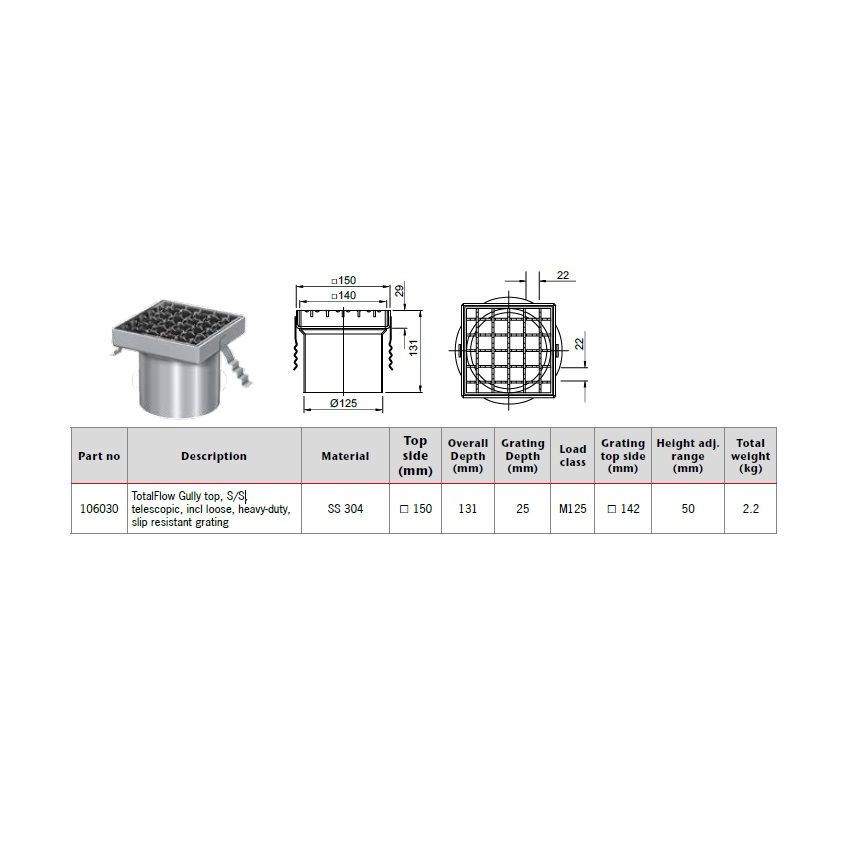ACO TotalFlow Gully Top Stainless Steel Telescopic with Heavy Duty Loose Slip Resistant Mesh Grate.