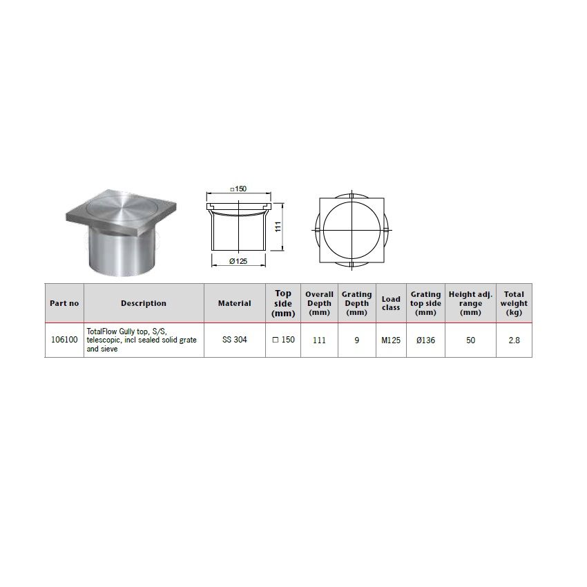 ACO TotalFlow Gully Top Stainless Steel Telescopic with Sealed Solid Grate & Sieve.