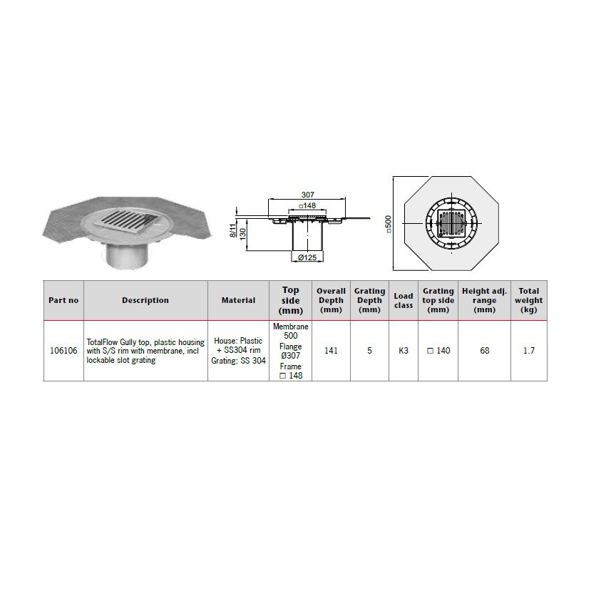ACO TotalFlow Gully Top Plastic with Stainless Steel Rim & Grate including membrane.