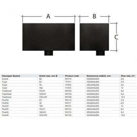 Alutec Evolve Large Aluminium Hopper Head, (A)430mm x (B)240mm x (C)225mm, 63mm outlet, together with a complete range of fittings. Available in a range of 19 RAL colours, on an estimated 10 working day lead-time.