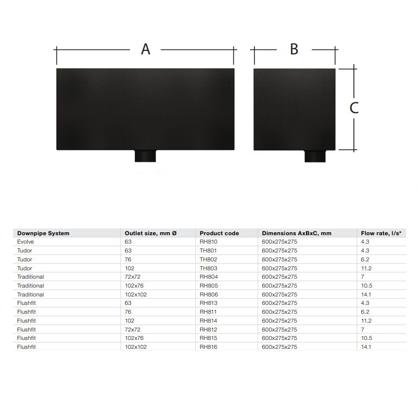 Alutec Extended Square & Rectangular Aluminium Hopper Head, (A)600mm x (B)275mm x (C)275mm, together with a complete range of fittings. Available in a range of 19 RAL colours, on an estimated 10 working day lead-time.