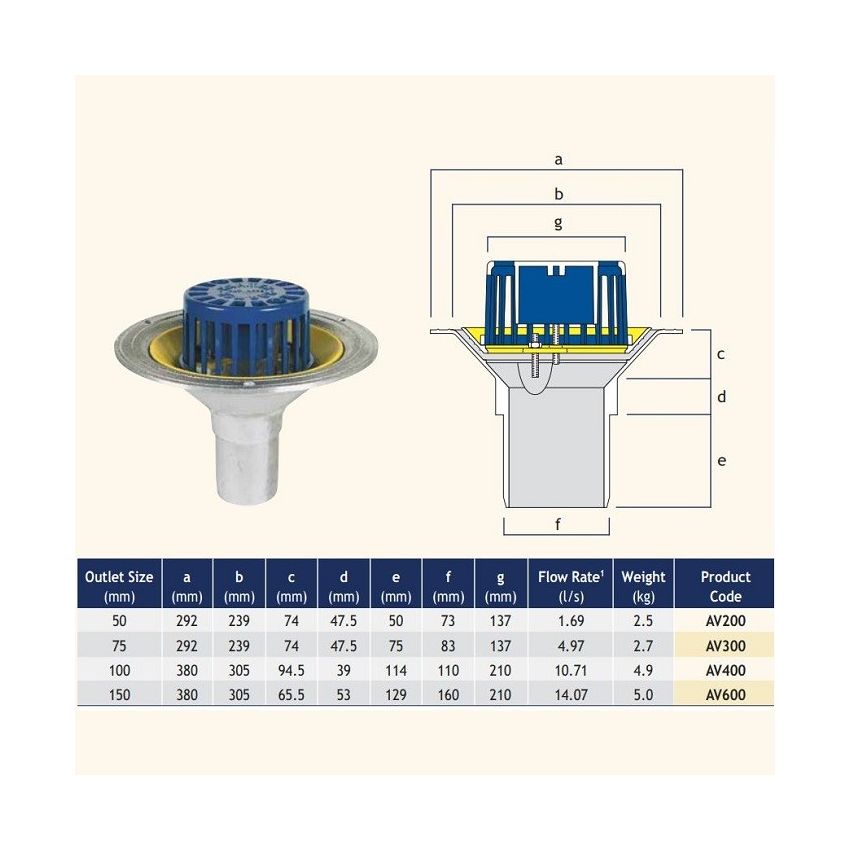 AV Vertical Spigot or Screw (Threaded Outlets) outlets provide anti-vortex performance within an economic range of general purpose outlets. Designed for connection to downpipes on a gravity system.