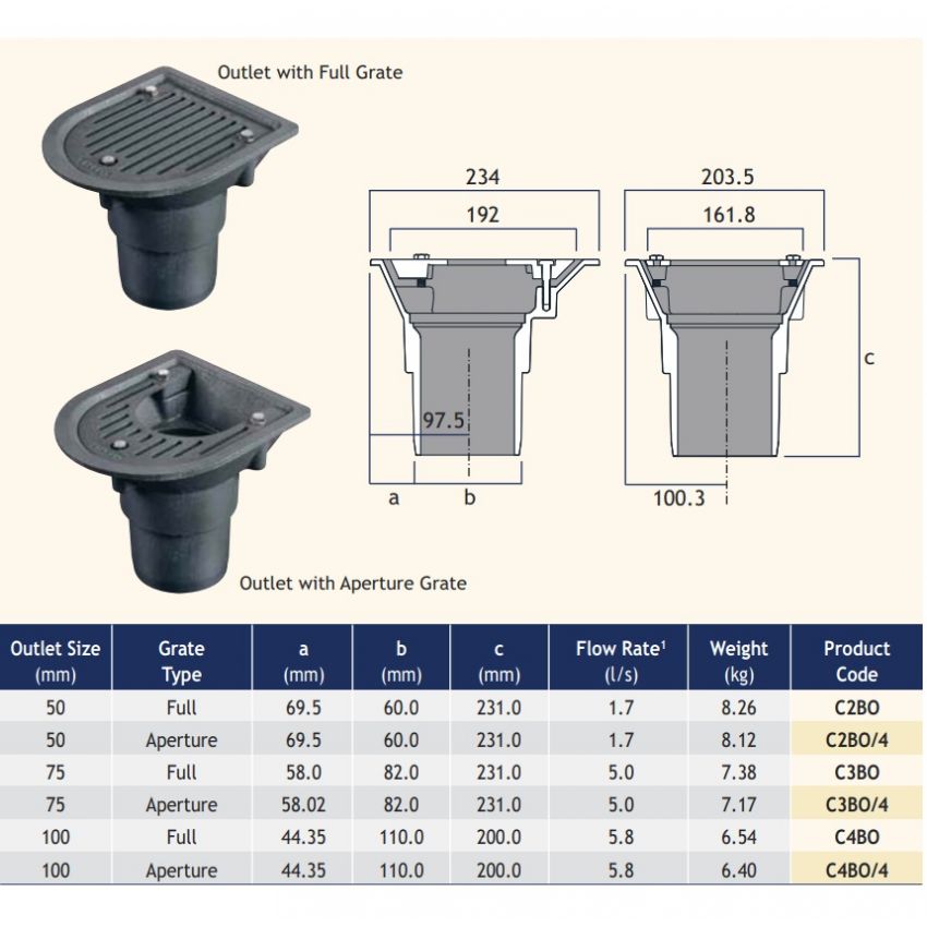 The vertical spigot options are suitable for direct connection to cast iron pipework to BS EN 877 and BS 416, HDPE and PVC O-ring socketed pipe to BS 4514 and BS EN1329-1.