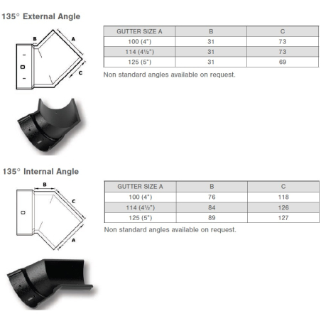 Cast Aluminium Beaded Half Round 135° External Angle, 3 profile widths, 100mm (4"), 115mm (4.5") & 130mm (5"), available with a complete range of gutter fittings, which include Stop Ends, Running Outlets, Gutter Angles, Non Standard, Irregular Angles, Raked Angles, Apex Angles.