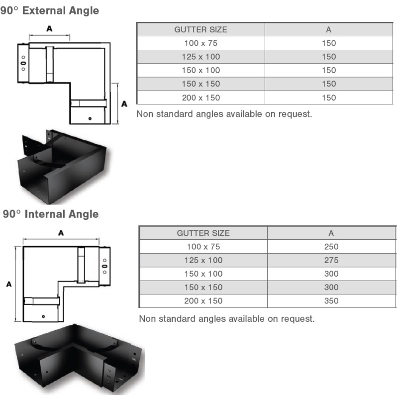Aluminium Box Joggle 90° Internal Angle available in 5 Profile sizes, 100mm x 75mm, 125mm x 100mm, 150mm x 100mm, 150mm x 150mm & 200mm x 150mm, with a complete range of gutter fittings, which include Stop Ends, Running Outlets, Gutter Angles, Non Standard, Irregular Angles, Raked Angles, Apex Angles.