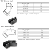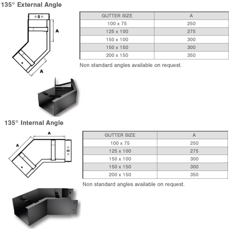 Aluminium Box Joggle 135° External Angle available in 5 Profile sizes, 100mm x 75mm, 125mm x 100mm, 150mm x 100mm, 150mm x 150mm & 200mm x 150mm, with a complete range of gutter fittings, which include Stop Ends, Running Outlets, Gutter Angles, Non Standard, Irregular Angles, Raked Angles, Apex Angles.