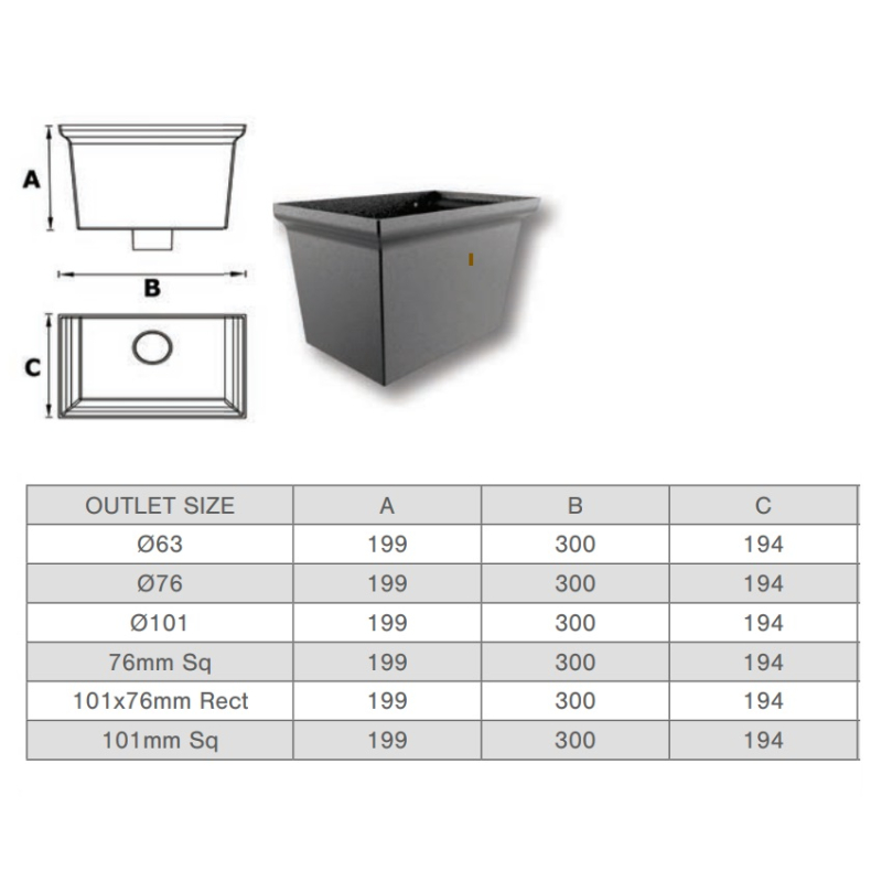 Cast Aluminium Large Rainwater Head, Hopper HT 194mm x Width 300mm x Depth 194mm, in 6 outlet sizes to suit 63mm, 76mm, 101mm, 76mm x 76mm, 101mm x 76mm & 101mm x 101mm downpipes only.