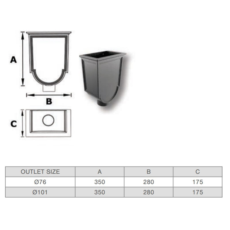 Cast Aluminium H1 Rainwater Head, Hopper HT 350mm x Width 280mm x Depth 175mm, in 2 outlet sizes to suit 76mm and 101mm downpipes only.