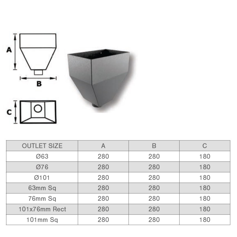 Cast Aluminium H0 Rainwater Head, Hopper, HT 280mm x Width 280mm x Depth 180mm, in 7 outlet sizes to suit 63mm, 76mm, 101mm, 63mm x 63mm, 76mm x 76mm, 101mm x 76mm & 101mm x 101mm downpipes only.