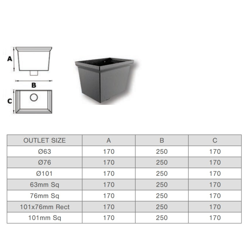 Cast Aluminium Small Rainwater Head, Hopper HT 170mm x Width 250mm x Depth 170mm, in 7 outlet sizes to suit 63mm, 76mm, 101mm, 63mm x 63mm, 76mm x 76mm, 101mm x 76mm & 101mm x 101mm downpipes only.