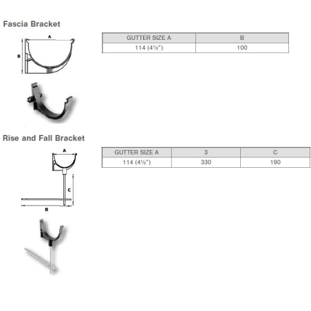 Cast Aluminium Deep Flow Half Round Rise and Fall Bracket, 1 profile 114mm (4.5") x 75mm (3"), available with a complete range of gutter fittings, which include Stop Ends, Running Outlets, Gutter Angles, Non Standard, Irregular Angles, Raked Angles, Apex Angles.