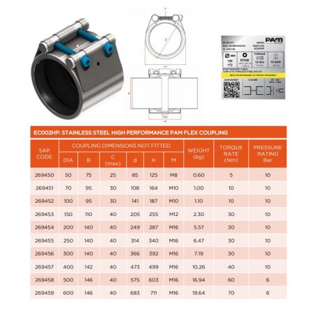 Pam Building Ensign Cast Iron High Performance Stainless Steel Coupling Non Grip, available in 100mm, 150mm, 200mm, 250mm, 300mm, 400mm, 500mm & 600mm diameter, Grade 316.