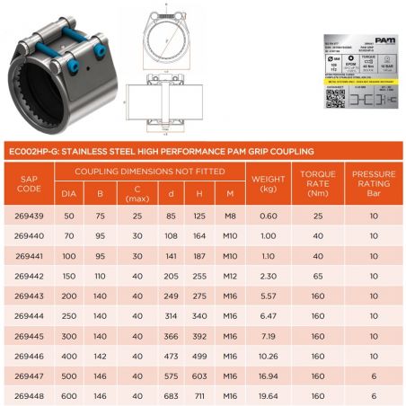 Pam Building Ensign Cast Iron High Performance Stainless Steel Grip Coupling, available in 50mm, 70mm, 100mm, 150mm, 200mm, 250mm, 300mm, 400mm, 500mm & 600mm diameter, Grade 316.