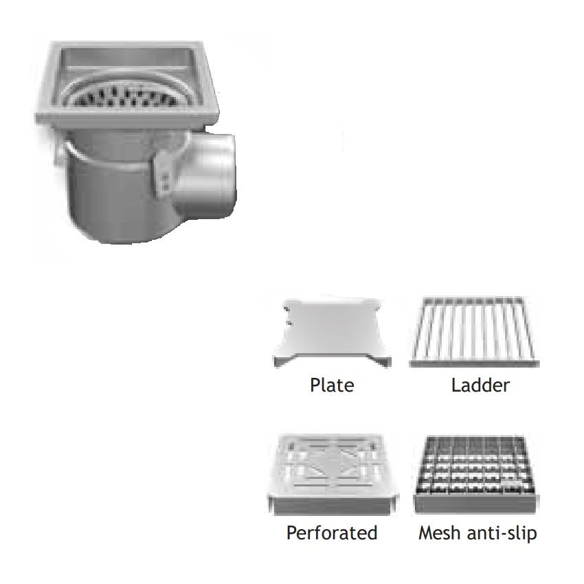 Harmer Stainless Steel Horizontal One-Part Fixed Compact Drain with Square Grate. Available in grate sizes 150mm x 150mm & 200mm x 200mm & 50mm & 110mm Outlet, with a choice of 4 grate finishes (Perforated, Mesh anti-slip, Ladder & Plate).
