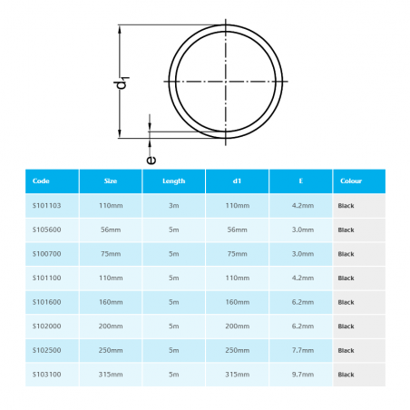 Marley HDPE Plastic Pipe, available in size range: 56mm, 75mm, 110mm, 160mm, 200mm, 250mm and 315mm, in 3m (110mm only) or 5m Lengths (available in black colour only).