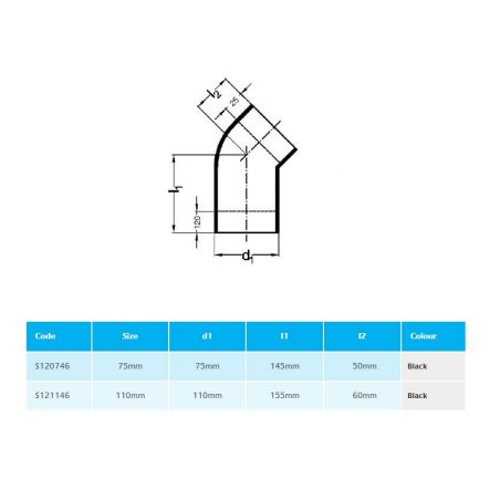 Marley HDPE Plastic 45 Degree Elbow (Long Spigot), available in size range: 75mm & 110mm (available in black colour only).