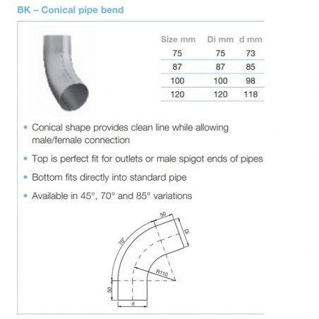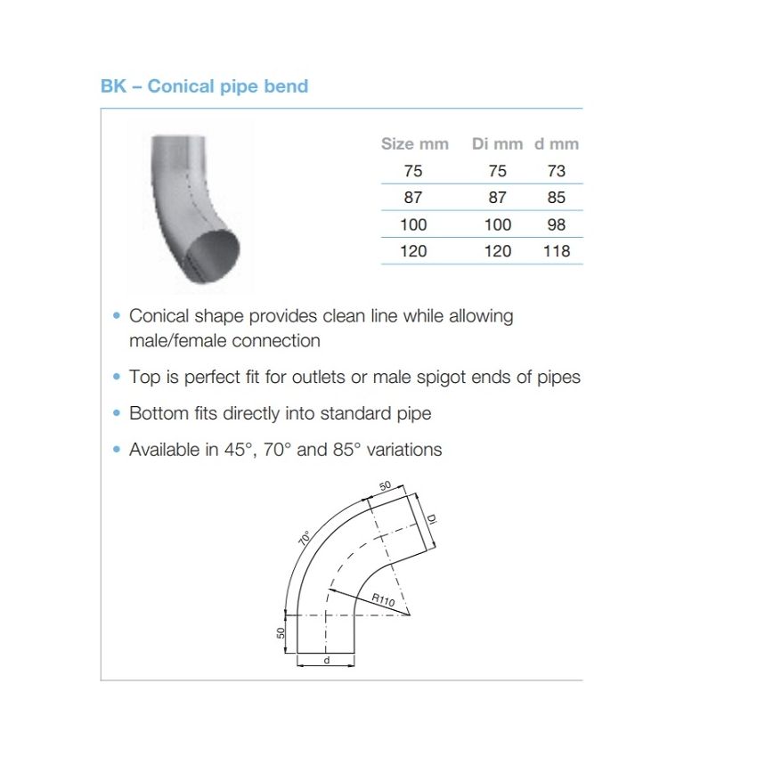 Lindab Circular Steel Downpipe Conical Pipe Bend 70 Degree (BK70), available in Galvanised Magestic Finish or a choice of eleven high-build polyester paint finishes. More information available at www.steelgutteringcentre.co.uk