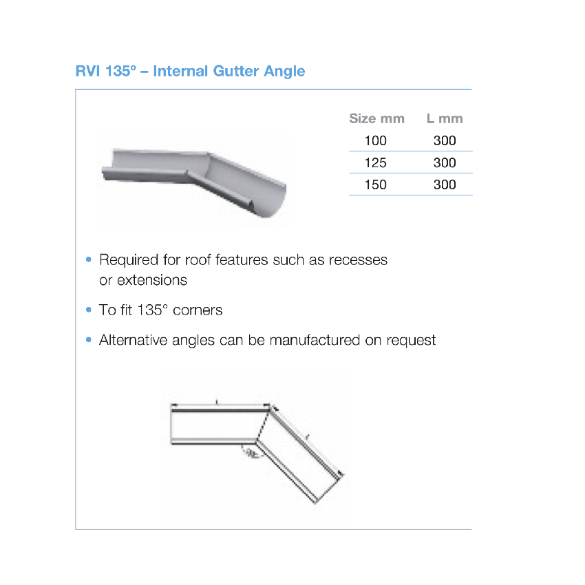 Lindab Magestic Galvanised Steel Half Round Gutter Angle Internal 135 degrees. 2 Gutter Joints are required per angle to joint back into the gutter. More information available at www.steelgutteringcentre.co.uk