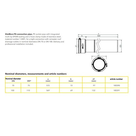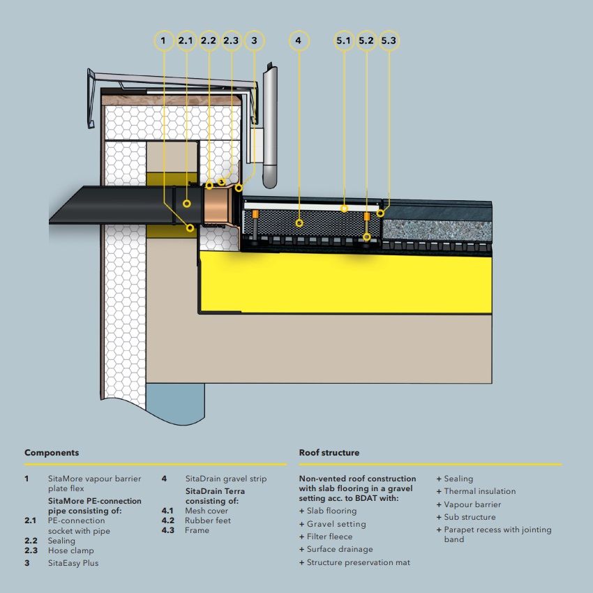 SitaEasy drains your roof for main and emergency drainage through the parapets. Custom-designed and foamed-in connecting sleeves allow for easy, reliable and homogeneous connections to the roof’s waterproofing.