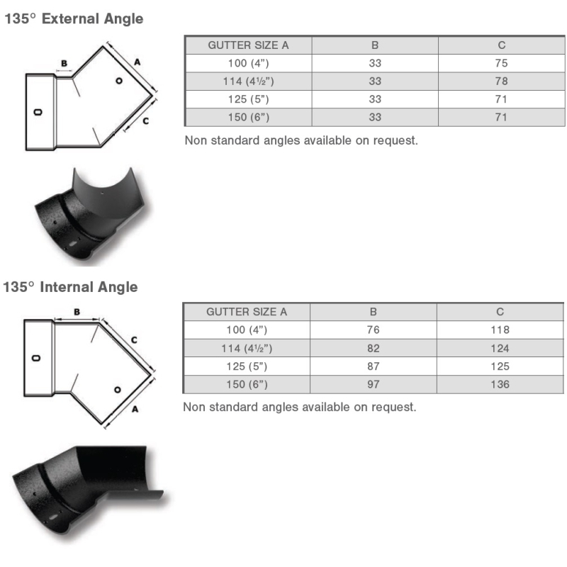 Cast Aluminium Plain Half Round 135° Internal Angle, 4 profile widths, 100mm (4"), 115mm (4.5"), 130mm (5") & 150mm (6"), available with a complete range of gutter fittings, which include Stop Ends, Running Outlets, Gutter Angles, Non Standard, Irregular Angles, Raked Angles, Apex Angles.