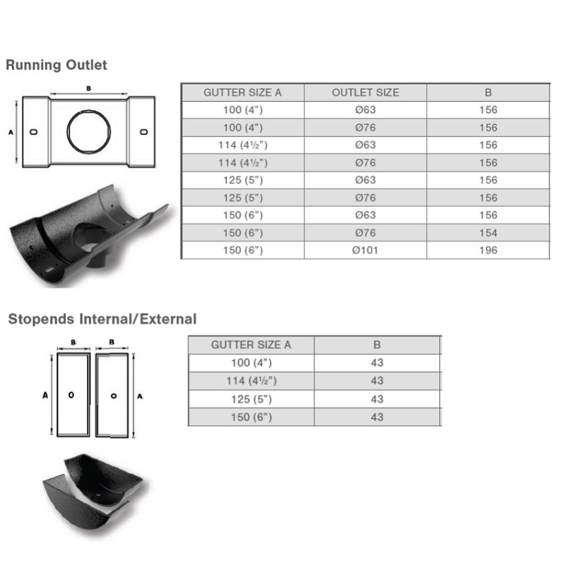 Cast Aluminium Plain Half Round Internal Stop End, 4 profile widths, 100mm (4"), 115mm (4.5"), 130mm (5") & 150mm (6"), available with a complete range of gutter fittings, which include Stop Ends, Running Outlets, Gutter Angles, Non Standard, Irregular Angles, Raked Angles, Apex Angles.