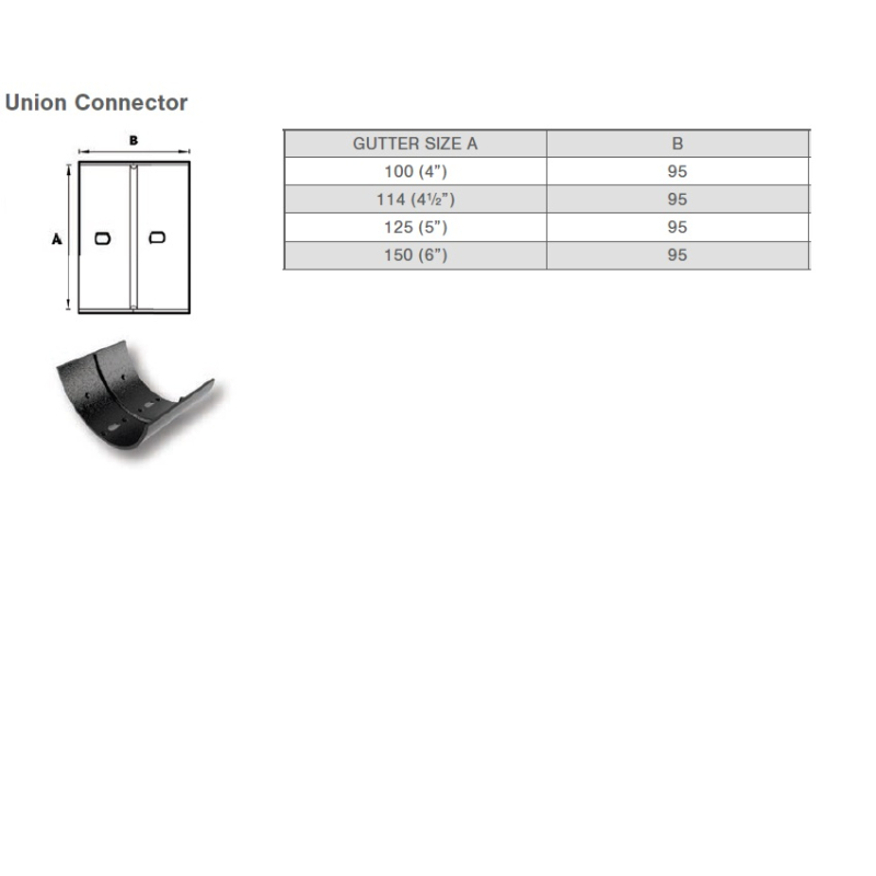 Cast Aluminium Plain Half Round Union Connector, 4 profile widths, 100mm (4"), 115mm (4.5"), 130mm (5") & 150mm (6"), available with a complete range of gutter fittings, which include Stop Ends, Running Outlets, Gutter Angles, Non Standard, Irregular Angles, Raked Angles, Apex Angles.