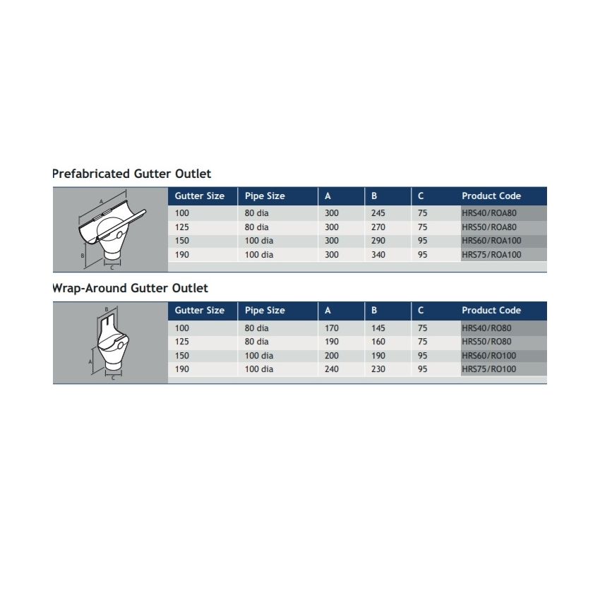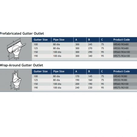 Pre-fabricated gutter outlets for 100mm & 125mm gutter size, will be supplied with outlets suitable to connect with 80mm downpipes. Gutter size 150mm will be supplied with outlets suitable for 100mmm size downpipes.