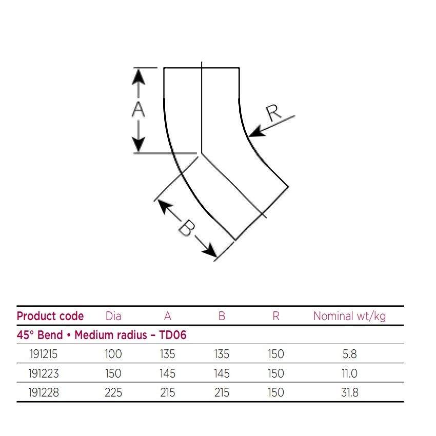 Pam Building Cast Iron 45 Degree Medium Radius Bend, available in 100mm, 150mm & 225mm diameter, for Below Ground.