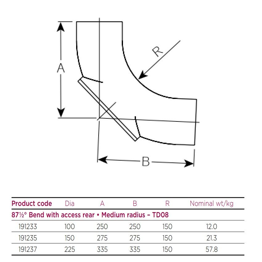 Pam Building Cast Iron 87.5 Degree Medium Radius Bend with Rear Access, available in 100mm, 150mm & 225mm diameter, for Below Ground.