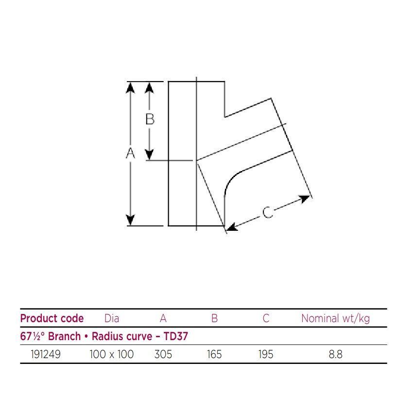 Pam Building Cast Iron 67.5 Degree Plain Single Branch, available in 100mm x 100mm diameter, for Below Ground.