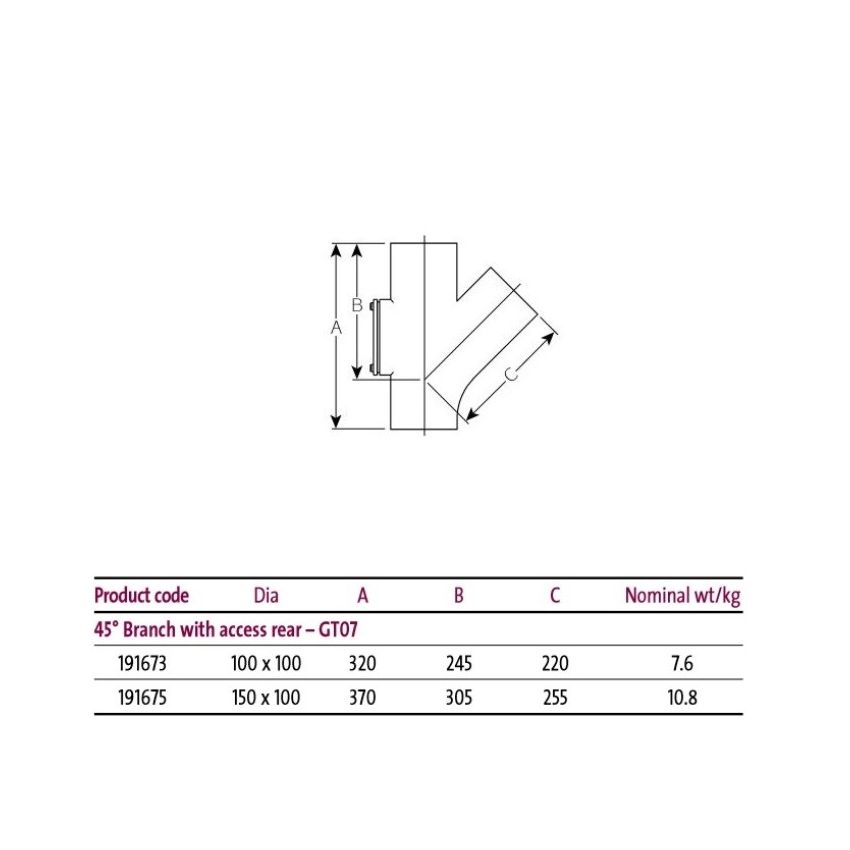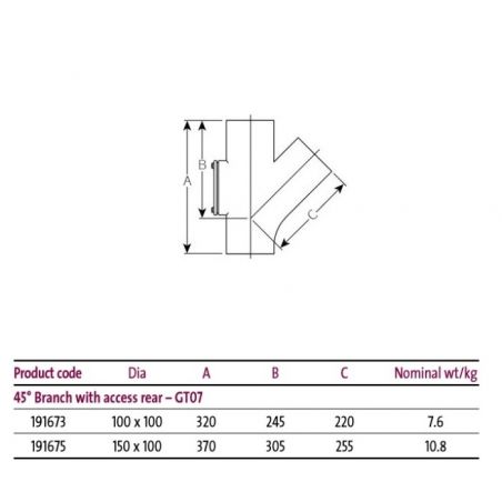 Pam Building Timesaver Cast Iron Soil 45 Degree Branch with Rear Access GT07, available in 100mm x 100mm & 150mm x 100mm diameter.