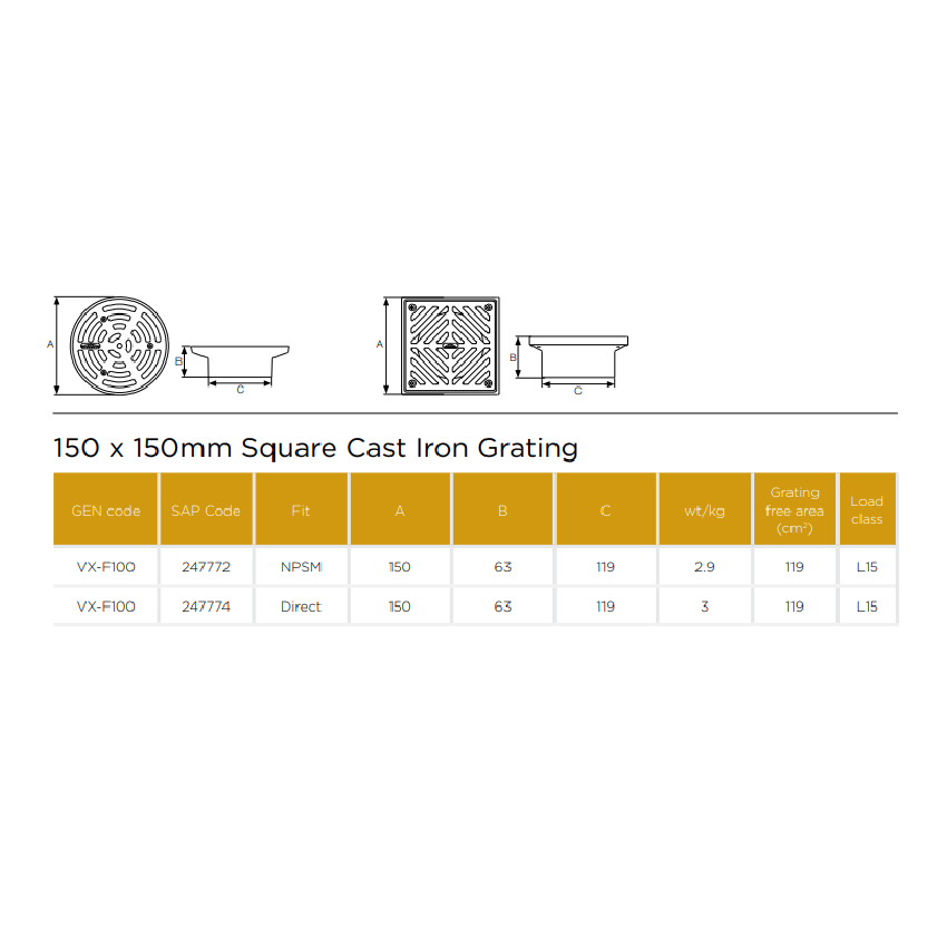 Pam Building VortX 150mm Square Grating In Cast Iron, available in both direct fix or NPSM Threaded.