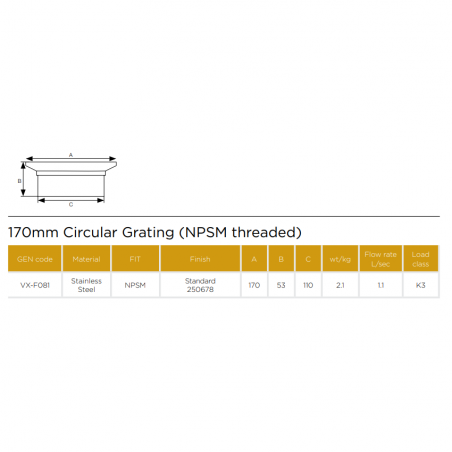 • Gratings Load class options as depicted in BS EN 1253: > K3—Pedestrian areas and wet room applications such as shower areas, bathrooms, swimming baths, leisure centres, balconies, retail areas, hotels, offices, schools, public buildings, hospitals, prisons, terraces and roof gardens > L15—Areas of light vehicular traffic such as cycle ways and domestic drives > M125—Car parks