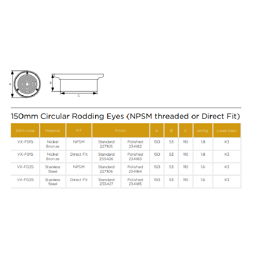 Pam BuildingVortX 150mm Circular Rodding Eyes, available in Stainless Steel for direct fix or NPSM Threaded.