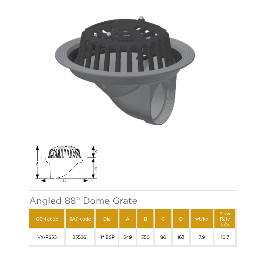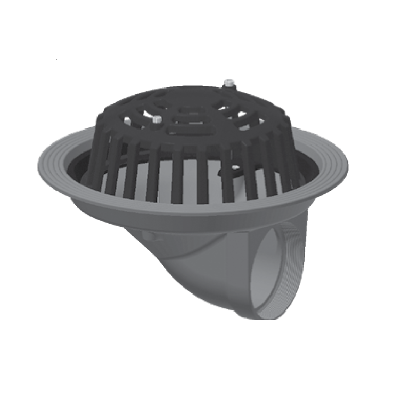Pam Building VORTX Horizontal Cast Iron 88 Degree Screw Roof Outlet, available with a flat or dome grate in 4" BSP. Dome grate loading class K3. Flat grate loading class L15.