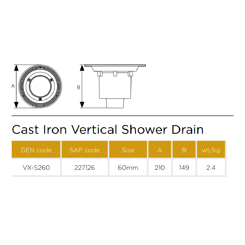Pam Building VortX Cast Iron Vertical Shower Drain, Body only. 60mm & 110mm sizes available